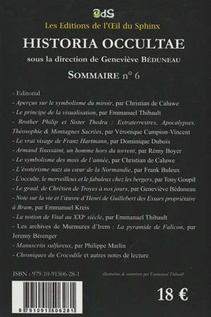 - Editorial - Aperçus sur le symbolisme du miroir, par Christian Caluwe - Le Principe de la visualisation, par Emmanuel Thibault - Brother Philip et Sister Thedra: Extraterrestres, Apocalypses, Théosophies & Montagnes Sacrées, par Véronique Campion-Vincent - Le vrai visage de Franz Hartman, par Dominique Dubois - Armand Toussaint, un homme hors du torrent, par Rémy Boyer - Le symbolisme des mois de l'année, par Christian de Caluwe - L'ésotérisme nazi au coeur de la Normandie, par Frank Buleux - L'Occulte, le merveilleux et le fabuleux chez les bergers, par Tony Goupil - Le Graal, de Chrétien de Troyes à nos jours, par Geneviève Béduneau - Note sur la vie et l'oeuvre d'Henri de Guilleret des Essars propriétaire à Bram, par Emmanuel Kreis - La notion de Vital au XXIe siècle, par Emmanuel Thibault - Les archives de Murmures d'Irem: La pyramide de Falicon, par Jeremy Bérenger - Manuscrits sulfureux, par Philippe Marlin - Chronique du Crocodile et autres notes de lecture