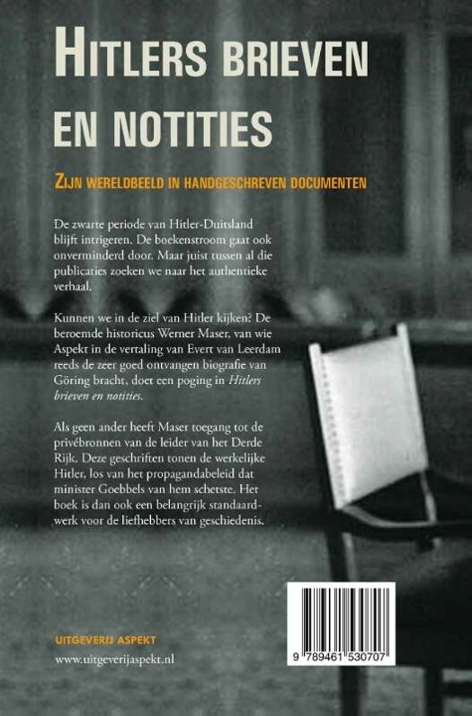 De zwarte periode van Hitler-Duitsland blijft intrigeren. De boekenstroom gaat ook onverminderd door. Maar juist tussen al die publicaties zoeken we naar het authentieke verhaal. Kunnen we in de ziel van Hitler kijken? De beroemde historicus Werner Maser, van wie Aspekt in de vertaling van Evert van Leerdam reeds de zeer goed ontvangen biogra e van Göring bracht, doet een poging in Hitlers brieven en notities. Als geen ander heeft Maser toegang tot de privébronnen van de leider van het Derde Rijk. Deze geschriften tonen de werkelijke Hitler, los van het propagandabeleid dat minister Goebbels van hem schetste. Het boek is dan ook een belangrijk standaardwerk voor de liefhebbers van geschiedenis.