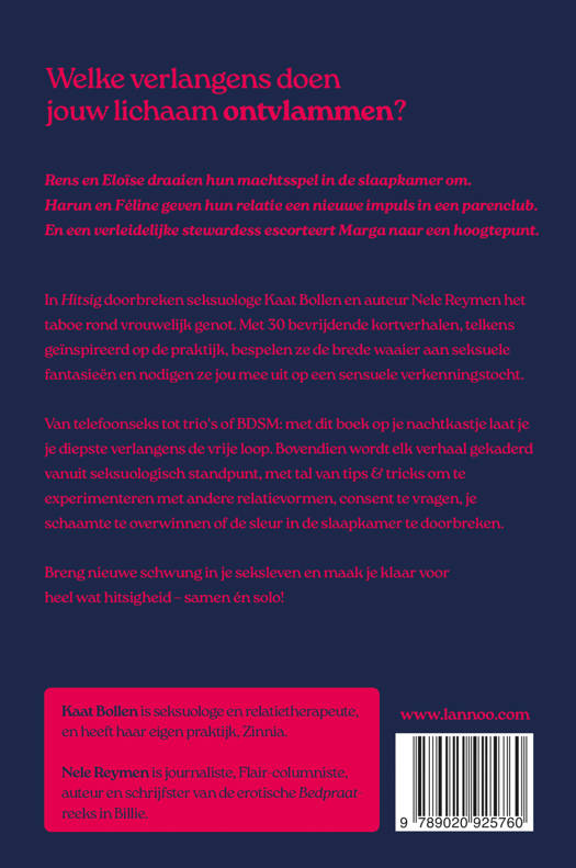 In Hitsig doorbreken seksuologe Kaat Bollen en auteur Nele Reymen het taboe rond vrouwelijk genot. Met 30 bevrijdende kortverhalen, telkens geïnspireerd op de praktijk, bespelen ze de brede waaier aan seksuele fantasieën en nodigen ze jou mee uit op een sensuele verkenningstocht.
