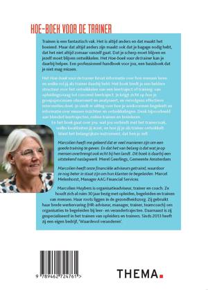 Trainen is een fantastisch vak. Het is altijd anders en dat maakt het boeiend. Maar dat altijd anders zijn, maakt ok dat het niet zomaar vanzelf gaat. Dat je scherp moet blijven en jezelf moet blijven ontwikkelen. Dit Hoe-boek voor de trainer helpt je daarbij. In deze herziene versie besteedt Marcolien meer aandacht aan online trainen. Welke tools zijn er? Wat maakt online leren en trainen anders en hoe zorg je voor een impactvol leertraject? Het Hoe-boek voor de trainer is een professioneel handboek voor trainers, boordevol theorie en uitleg over het trainersvak. Bijzonder bruikbaar bij het ontwikkelen, voorbereiden en uitvoeren van een (online) training.