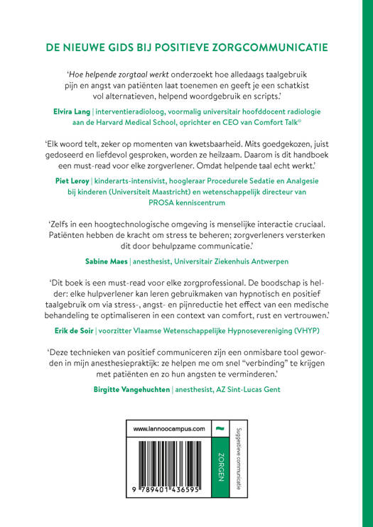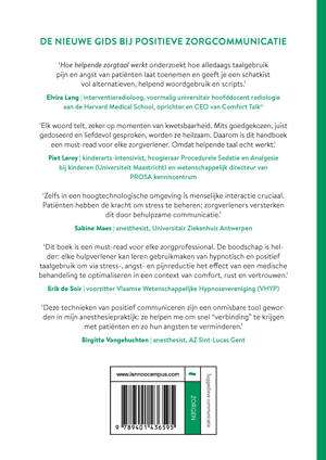 - Sabine Maes | anesthesist, Universitair Ziekenhuis Antwerpen'Dit boek is een must-read voor elke zorgprofessional. De boodschap is helder: elke hulpverlener kan leren gebruikmaken van hypnotisch en positief taalgebruik om via stress-, angst- en pijnreductie het effect van een medische behandeling te optimaliseren in een context van comfort, rust en vertrouwen.'