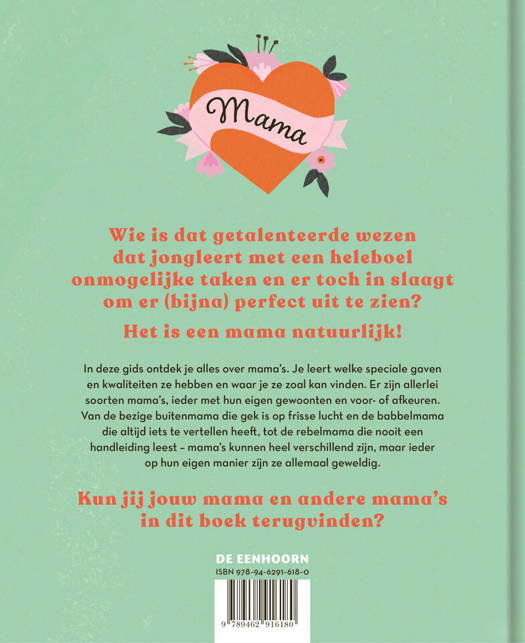In deze gids ontdek je alles over mama's. Je leert welke speciale gaven en kwaliteiten ze hebben en waar je ze zoal kan vinden. Er zijn allerlei soorten mama's, ieder met hun eigen gewoonten en voor- of afkeuren. Van de bezige buitenmama die gek ik op frisse lucht en de babbelmama die altijd iets te vertellen heeft, tot de rebelmama die nooit een handleiding leest - mama's kunnen heel verschillend zijn, maar ieder op hun eigen manier zijn ze allemaal geweldig.