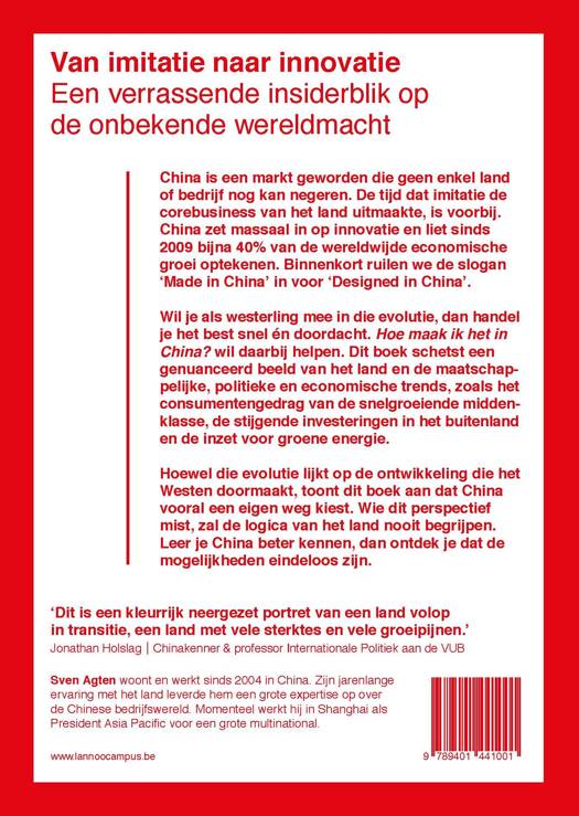 Een verrassende insiderblik op de onbekende wereldmacht China is een markt geworden die geen enkel land of bedrijf nog kan negeren. De tijd dat imitatie de corebusiness van het land uitmaakte, is voorbij. China zet massaal in op innovatie en liet sinds 2009 bijna 40% van de wereldwijde economische groei optekenen. Binnenkort ruilen we de slogan 'Made in China' in voor 'Designed in China'. Wil je als westerling mee in die evolutie, dan handel je het best snel én doordacht. Hoe maak ik het in China? wil daarbij helpen. Dit boek schetst een genuanceerd beeld van het land en de maatschappelijke, politieke en economische trends, zoals het consumentengedrag van de snelgroeiende middenklasse, de stijgende investeringen in het buitenland en de inzet voor groene energie. Hoewel die evolutie lijkt op de ontwikkeling die het Westen doormaakt, toont dit boek aan dat China vooral een eigen weg kiest. Wie dit perspectief mist, zal de logica van het land nooit begrijpen. Leer je China beter kennen, dan ontdek je dat de mogelijkheden eindeloos zijn.