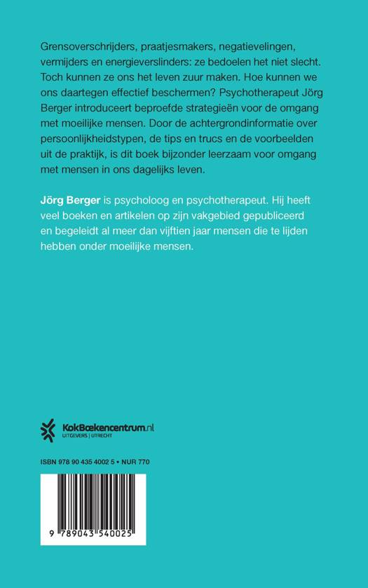 In Hoe overleef ik moeilijke mensen? introduceert psychotherapeut Jörg Berger beproefde strategieën voor de omgang met moeilijke mensen. Grensoverschrijders, praatjesmakers, dominante mensen, negatievelingen, wraakzuchtigen, vermijders en energieverslinders: ze bedoelen het niet slecht. Toch kunnen ze ons het leven zuur maken, energie uit ons zuigen en het uiterste van ons vergen. Hoe kunnen we ons daar effectief tegen beschermen? En, als het even kan, zonder zelf een moeilijke mens te worden?Door de achtergrondinformatie over persoonlijkheidstypen, de tips en trucs en de voorbeelden uit de praktijk, is dit boek bijzonder leerzaam en waardevol voor omgang met mensen in ons dagelijks leven.