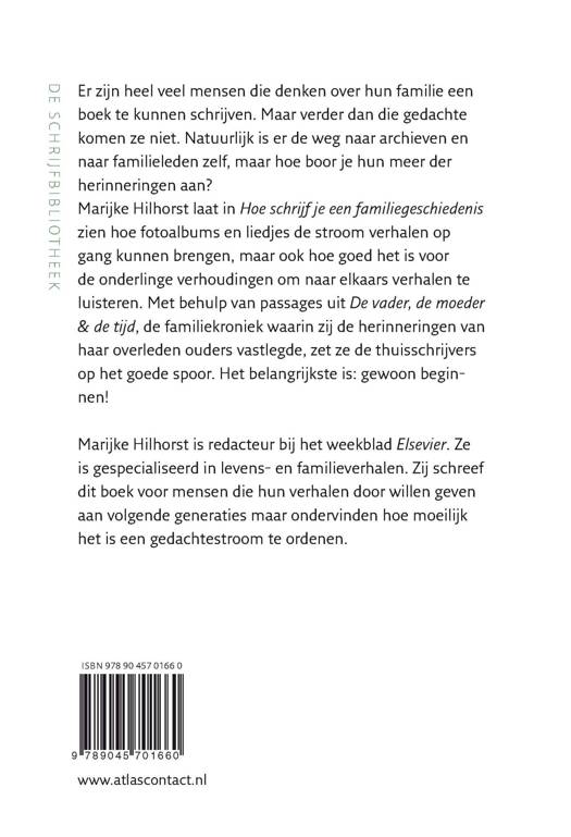 Er zijn heel veel mensen die denken over hun familie wel een boek te kunnen schrijven. Maar verder dan die gedachte komen ze niet. Marijke Hilhorst, die de herinneringen van en over haar overleden ouders vastlegde in de familiekroniek De vader, de moeder & de tijd, dat inmiddels al vier keer is herdrukt, is al vaak gevraagd uit te leggen hoe ze al die gebeurtenissen zo helder en vooral zo beeldend heeft kunnen opschrijven. Ze gaf diverse workshops en schreef voor alle mensen die hun verhalen door willen geven aan volgende generaties maar telkens weer ondervinden hoe moeilijk het is een gedachtestroom te ordenen: Hoe schrijf je familiegeschiedenis.