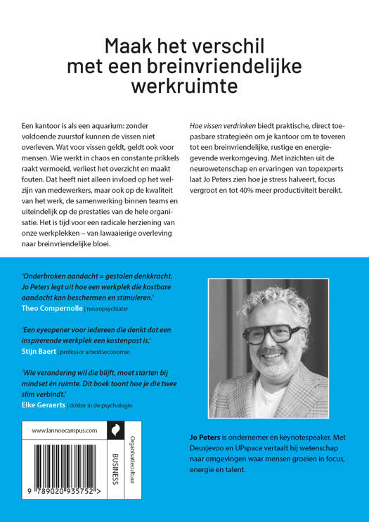 Hoe vissen verdrinken biedt praktische, direct toepasbare strategieën om je kantoor om te toveren tot een breinvriendelijke, rustige en energiegevende werkomgeving. Met inzichten uit de neurowetenschap en ervaringen van topexperts laat Jo Peters zien hoe je stress halveert, focus vergroot en tot 40% meer productiviteit bereikt.
