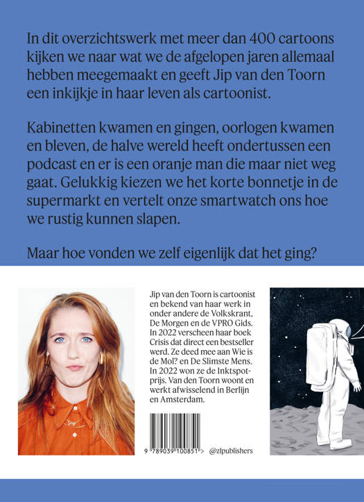 Een beeld zegt meer dan duizend woorden. Niemand weet die beelden scherper neer te zetten dan Jip van den Toorn. In dit overzichtswerk met meer dan 400 cartoons kijken we naar wat we de afgelopen jaren allemaal hebben meegemaakt en geeft Jip van den Toorn een inkijkje in haar leven als cartoonist. Kabinetten kwamen en gingen, oorlogen kwamen en bleven, de halve wereld heeft ondertussen een podcast en er is een oranje man die maar niet weggaat. Gelukkig kiezen we het korte bonnetje in de supermarkt en vertelt onze smartwatch ons hoe we rustig kunnen slapen.