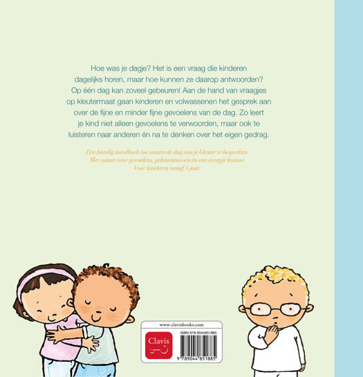 Hoe was je dagje? Het is een vraag die kinderen dagelijks horen, maar hoe kunnen ze daarop antwoorden? Op één dag kan zoveel gebeuren! Aan de hand van vraagjes op kleutermaat gaan kinderen en volwassenen het gesprek aan over de fijne en minder fijne gevoelens van de dag. Zo leert je kind niet alleen gevoelens te verwoorden, maar ook te luisteren naar anderen én na te denken over het eigen gedrag.
