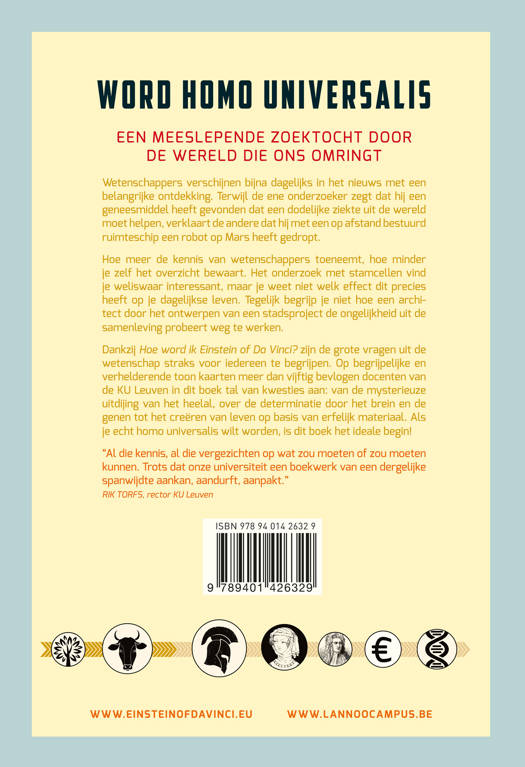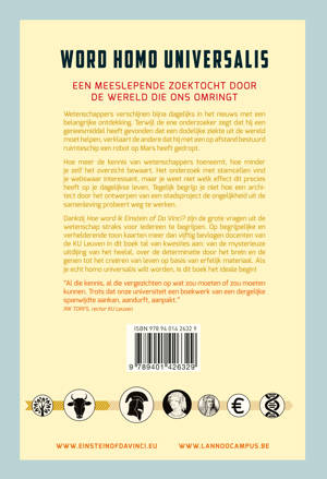 Een meeslepende zoektocht door de wereld die ons omringt Wetenschappers verschijnen bijna dagelijks in het nieuws met een belangrijke ontdekking. Terwijl de ene onderzoeker zegt dat hij een geneesmiddel heeft gevonden dat een dodelijke ziekte uit de wereld moet helpen, verklaart de andere dat hij met een op afstand bestuurd ruimteschip een robot op Mars heeft gedropt. Hoe meer de kennis van wetenschappers toeneemt, hoe minder je zelf het overzicht bewaart. Het onderzoek met stamcellen vind je weliswaar interessant, maar je weet niet welk effect dit precies heeft op je dagelijkse leven. Tegelijk begrijp je niet hoe een architect door het ontwerpen van een stadsproject de ongelijkheid uit de samenleving probeert weg te werken. Dankzij Hoe word ik Einstein of Da Vinci? zijn de grote vragen uit de wetenschap straks voor iedereen te begrijpen. Op begrijpelijke en verhelderende toon kaarten meer dan vijftig bevlogen docenten van de KU Leuven in dit boek tal van kwesties aan: van de mysterieuze uitdijing van het heelal, over de determinatie door het brein en de genen tot het creëren van leven op basis van erfelijk materiaal. Als je echt homo universalis wilt worden, is dit boek het ideale begin!
