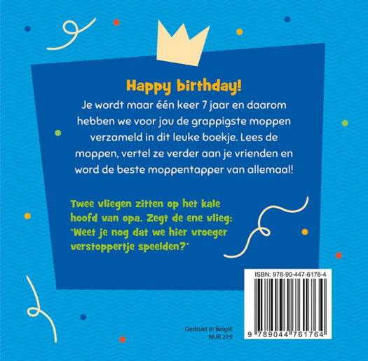Happy birthday! In dit boek vind je de grappigste moppen voor kinderen die 7 jaar worden, wat dit het ultieme cadeautje maakt voor elk jarig kind dat van grappen houdt. Hier maak je het feestvarken vast en zeker erg blij mee! Twee vliegen zitten op het kale hoofd van opa. Zegt de ene vlieg: 'Weet je nog dat we hier vroeger verstoppertje speelden?' Meester: 'Je bent alweer te laat op school, Finn!' Finn: 'Te laat? En gisteren zei je nog dat het nooit te laat is om te leren!' Waarom zingt een koe nooit een liedje? Omdat ze bang is dat de andere koeien 'boe' zullen roepen.