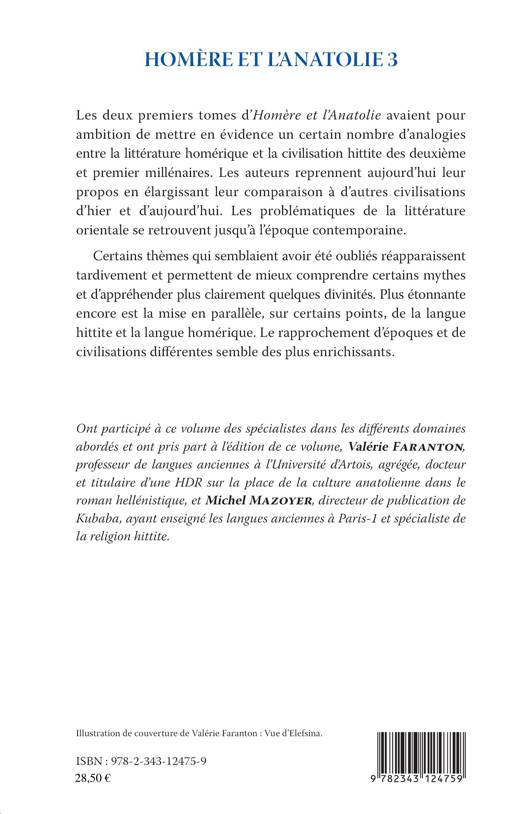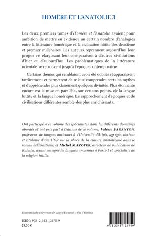 Les deux premiers tomes d' « Homère et l'Anatolie » avaient pour ambition de mettre en évidence un certain nombre d'analogies entre la littérature homérique et la civilisation hittite des deuxièmes et premier millénaires. Les auteurs reprennent aujourd'hui leur propos en élargissant leur comparaison à d'autres civilisations d'hier et d'aujourd'hui. Certains thèmes qui semblaient avoir été oubliés réapparaissent tardivement et permettent ainsi de mieux comprendre certains mythes.