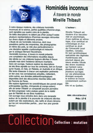 À notre époque moderne, des créatures hominidées inconnues de la science, parfois qualifiées d'homme-singe, sont signalées aux quatre coins de la planète. De telles descriptions ne datent pas d'hier puisqu'il existe plusieurs représentations d'hommes sauvages retrouvées sur divers objets et bâtiments anciens. L'étude de ces hominidés méconnus, dont nous possédons parfois des empreintes, des photographies et même des poils, se relie plus particulièrement à une discipline appelée cryptozoologie et instaurée par le zoologue Bernard Heuvelmans. Ce livre présente une compilation des informations recueillies depuis des siècles sur ces créatures. Dans cet ouvrage, l'auteure explore les descriptions de tels Etres signalés sur tous les continents, tant en Europe qu'en Russie, en Asie, en Malaise, en Australie et en Afrique. Elle tente d'associer à chacun une explication pertinente en lien avec nos connaissances actuelles, s'attardant, entre autres, aux données paléoanthropologiques disponibles dont des découvertes récentes telles celle de l'homme de Flores. Elle explore également les caractéristiques des grands singes anthropoïdes (gorilles, chimpanzés et orangs-outans) afin de tenter d'établir un comparatif pouvant permettre de faire progresser notre analyse autant de la réalité que de l'identité de ces êtres mystérieux. Cet ouvrage nous entraîne donc dans une escapade autour de la planète à la poursuite de créatures décrites autant par des explorateurs, des natifs et divers témoins qui les ont rencontrées parfois… pour leur plus grande terreur !
