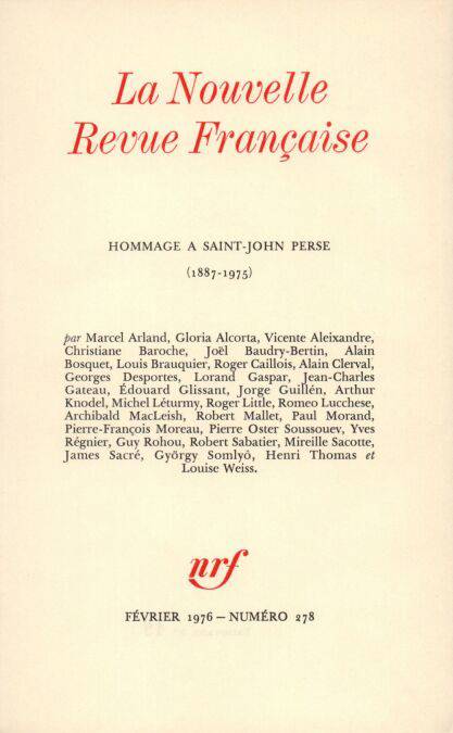 Marcel Arland, Présence de Saint-John Perse Gloria Alcorta, Saint-John Perse en voyage de noces Vicente Aleixandre, Comme d'hier Christiane Baroche, Le poète et l'homme Joël Baudry-Bertin, Simplement Alain Bosquet, Comme un refus de l'Occident Louis Brauquier, Seigneur, je ne suis pas digne Roger Caillois, Reconnaissance à Saint-John Perse Alain Clerval, Faire allégeance au discours... Georges Desportes, Saint-John Perse, poète créole ou l'insulaire révolté? Lorand Gaspar, À Saint-John Perse Jean-Charles Gateau, I grecs amers Édouard Glissant, Saint-John Perse et les Antillais Jorge Guillén, Colonie archaïsante Arthur Knodel, Message du pays d'exil Michel Léturmy, C'était un très grand livre Roger Little, De l'ombre d'un grand arbre... Romeo Lucchese, Saint-John Perse écrivait 'pour mieux vivre' Archibald MacLeish, Souvenir de Perse Robert Mallet, L'Heure du Testament Paul Morand, Saint-John Perse à Londres, en 1940 Pierre-François Moreau, Le rythme du monde Pierre Oster, Adieu à Leger Yves Régnier, L'ambassade de Saint-John Perse Guy Rohou, L'âme très foraine Robert Sabatier, L'été plus vaste que l'empire... Mireille Sacotte, Sur Saint-John Perse, à propos de musique James Sacré, Saint-John Perse György Somlyó, Ailleurs Henri Thomas, Le songe de Crusoé Louise Weiss, Alexis, fils exemplaire