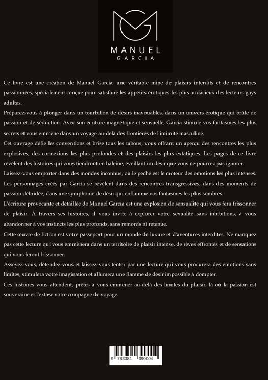 Ce livre est une création de Manuel Garcia, une véritable mine de plaisirs interdits et de rencontres passionnées, spécialement conçue pour satisfaire les appétits érotiques les plus audacieux des lecteurs gays adultes.Prépare-toi à te plonger dans un tourbillon de désirs inavouables, dans un univers érotique qui brûle de passion et de séduction. Avec son écriture magnétique et sensuelle, Garcia stimule tes fantasmes les plus secrets, t'emmenant dans un voyage au-delà des frontières de l'intimité masculine.Cet ouvrage défie les conventions et brise tous les tabous, t'offrant un aperçu des rencontres les plus explosives, des connexions les plus profondes et des plaisirs les plus extatiques. Les pages de ce livre révèlent des histoires qui te tiendront collé aux mots, éveillant un désir que tu ne pourras pas ignorer.Laisse-toi emporter dans des mondes inconnus, où le péché est le moteur des émotions les plus intenses. Les personnages créés par García se révèlent dans des rencontres transgressives, dans des moments de passion débridée, dans une symphonie de désir qui enflamme tes fantasmes les plus sombres.L'écriture provocante et détaillée de Manuel García est une explosion de sensualité qui te fera frissonner de plaisir. À travers ses histoires, il t'invite à explorer ta sexualité sans inhibitions, à t'abandonner à tes instincts les plus profonds, sans remords ni retenue.Cette oeuvre de fiction est ton passeport pour un monde de luxure et d'aventures interdites. Ne manque pas cette lecture qui t'emmènera dans un territoire de plaisir intense, de rêves effrontés et de sensations qui te feront frissonner.Assieds-toi, détends-toi et laisse-toi aller à une lecture qui te procurera des émotions sans limites, stimulera ton imagination et allumera une flamme de désir qui ne peut être apprivoisée.Ces histoires t'attendent, prêtes à t'emmener au-delà des limites du plaisir, là où la passion est souveraine et où l'extase est ton compagnon de voyage.