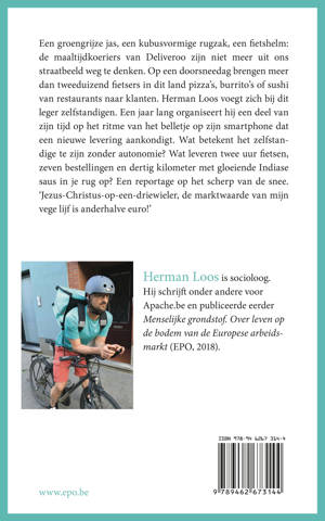 Een groengrijze jas, een kubusvormige rugzak, een fietshelm: de maaltijdkoeriers van Deliveroo zijn niet meer uit ons straatbeeld weg te denken. Op een doorsneedag brengen meer dan tweeduizend fietsers in dit land pizza’s, burrito’s of sushi van restaurants naar klanten. Herman Loos voegt zich bij dit leger zelfstandigen. Een jaar lang organiseert hij een deel van zijn tijd op het ritme van het belletje op zijn smartphone dat een nieuwe levering aankondigt. Wat betekent het zelfstandige te zijn zonder autonomie? Wat leveren twee uur fietsen, zeven bestellingen en dertig kilometer met gloeiende Indiase saus in je rug op? Een reportage op het scherp van de snee. ‘Jezus-Christus-op-een-driewieler, de marktwaarde van mijn veiligheid is anderhalve euro.’