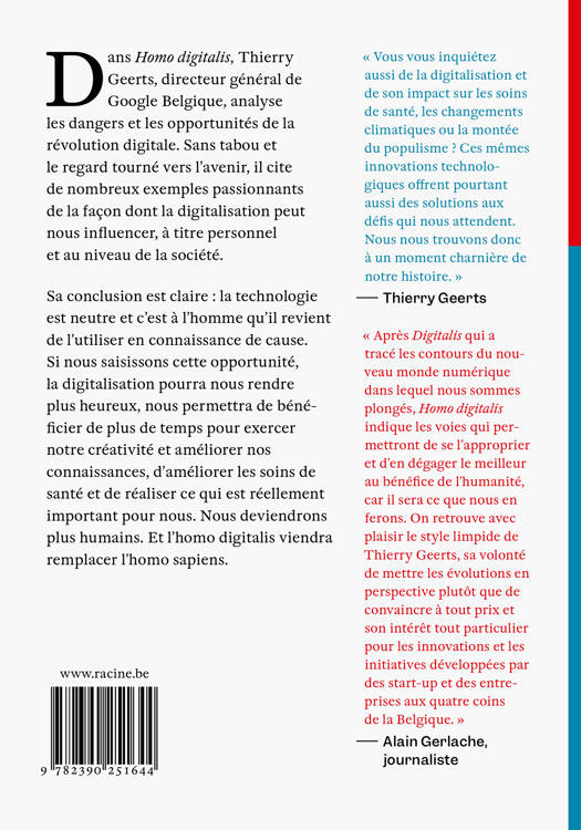 Dans Homo Digitalis, Thierry Geerts, directeur général de Google Belgique, analyse les dangers et les opportunités de la révolution digitale. Sans tabou et le regard tourné vers l'avenir, il cite de nombreux exemples passionnants de la façon dont la digitalisation peut nous influencer, à titre personnel et au niveau de la société.