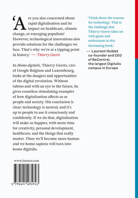 Homo digitalis, Thierry Geerts, CEO of Google Belgium and Luxembourg, looks at the dangers and opportunities of the digital revolution. Without taboos and with an eye to the future, he offers thoughtful examples of how digitalization affects us as people and as a society. His conclusion is clear: technology is neutral, and it's up to people to use it consciously and confidently. If we do that, digitalization will make us happier, with more time for creativity, personal development, healthcare, and the things that really matter. Then we'll become more human and we homo sapiens will turn into homo digitalis.