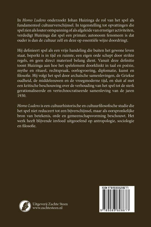 Homo Ludens is een cultuurhistorische en cultuurfilosofische studie die het spel niet reduceert tot een bijverschijnsel, maar als oorspronkelijke bron van betekenis, orde en gemeenschapsvorming beschouwt. Het werk heeft blijvende invloed uitgeoefend op antropologie, sociologie en filosofie.