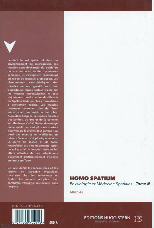 Pendant le vol spatial et dans un environnement de microgravité, les muscles sont déchargés du poids du corps et au cours des deux premières semaines, les muscles s'atrophient rapidement en raison du manque d'utilisation. Les changements caractéristiques des muscles en microgravité sont la dégradation rapide des muscles antigravitaires et la transformation des fibres musculaires à contraction lente en fibres musculaires à contraction rapide. Les muscles posturaux contenant plus de fibres lentes sont plus sujets à l'atrophie. Ainsi, dans l'espace, ce sont les muscles des jambes, du dos et de la colonne vertébrale qui s'affaiblissent davantage parce qu'ils ne sont plus nécessaires pour vaincre la gravité, tout comme l'on perd des muscles en vieillissant en raison d'une activité physique réduite. La perte de masse et de force musculaires est plus importante après un vol spatial de longue durée et les effets néfastes de ces adaptations deviennent particulièrement évidents au retour sur Terre. Ce livre décrit les mécanismes et les raisons de l'atrophie musculaire constatée chez les astronautes et évalue les moyens adoptés pour combattre l'atrophie musculaire dans l'espace.
