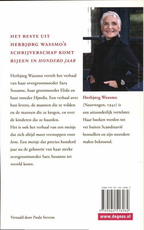 In Honderd jaar vertelt Herbjørg Wassmo het verhaal van haar overgrootmoeder Sara Susanne, haar grootmoeder Elida en haar moeder Hjørdis. Een verhaal over hun levens, de mannen die ze wilden en de mannen die ze kregen, en over de kinderen die ze baarden. Het is ook het verhaal van een meisje dat zich altijd moet verstoppen voor hem. Een meisje dat precies honderd jaar na de geboorte van haar sterke overgrootmoeder Sara Susanne ter wereld komt.