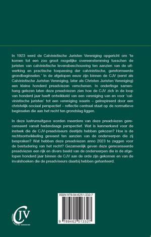 In 1923 werd de Calvinistische Juristen Vereniging opgericht om ‘te komen tot een zoo groot mogelijke overeenstemming tusschen de juristen van calvinistische levensbeschouwing ten aanzien van de uitwerking en practische toepassing der calvinistische, gereformeerde grondbeginselen.’ In de afgelopen eeuw zijn binnen de CJV (eerst als Calvinistische Juristen Vereniging, later als Christen Juristen Vereniging) een kleine honderd preadviezen verschenen. In onderlinge samenhang gelezen laten deze preadviezen zien hoe de CJV zich in de loop van honderd jaar heeft ontwikkeld van een vereniging van en voor ‘calvinistische juristen’ tot een vereniging waarin – geïnspireerd door een christelijk-sociaal perspectief – reflectie centraal staat op de normatieve beginselen die aan het recht ten grondslag liggen.