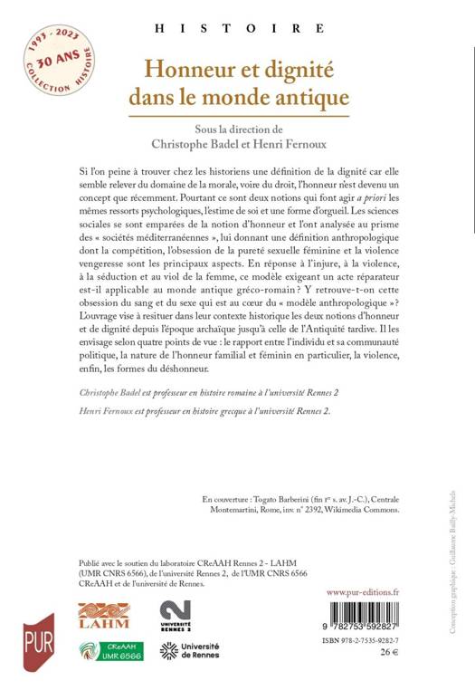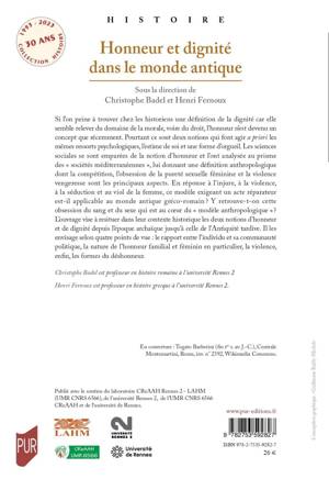 L’ouvrage vise à resituer dans leur contexte historique les deux notions d’honneur et de dignité depuis l’époque archaïque jusqu’à celle de l’Antiquité tardive. Il les envisage selon quatre points de vue : le rapport entre l’individu et sa communauté politique, la nature de l’honneur familial et féminin en particulier, la violence, enfin, les formes du déshonneur.
