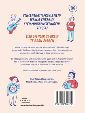 Concentratieproblemen?Weinig energie?Stemmingswisselingen?Stress? Tijd om voor je brein te gaan zorgen. Nieuw onderzoek toont aan dat wie goed voor zijn brein zorgt, beter leeft. Wat je eet, hoe je slaapt, beweegt, leert en met anderen omgaat, het heeft allemaal invloed op je hersenen. In dit toegankelijke en breinvriendelijke boek laat dr. Clara Doran zien hoe je jouw brein de beste zorg geeft. Het boek staat boordevol praktische tips om je hersenen te laten floreren. Geef je brein een oppepper met deze gids! Meer focus. Meer energie.Meer balans. Meer levensvreugde.