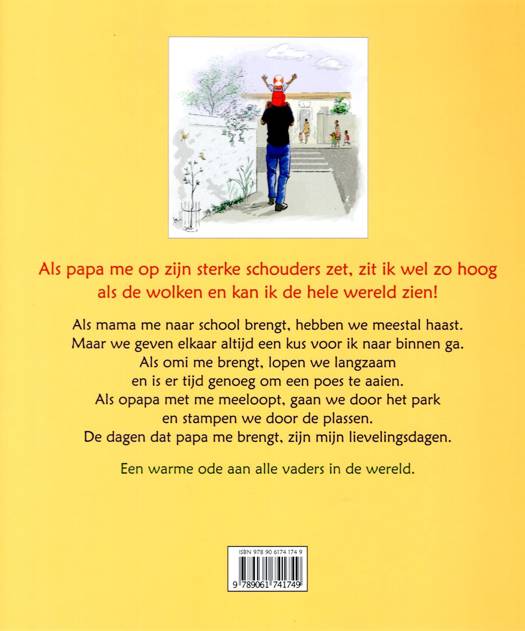 Als omi me brengt, lopen we langzaam en is er tijd genoeg om een poes te aaien. Als papa met me meeloopt, gaan we door het park en stampen we door de plassen. De dagen dat papa me brengt, zijn mijn lievelingsdagen.