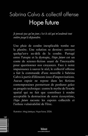 Une pluie de cendre inexplicable tombe sur la planète. Une solution se dessine : envoyer quelqu'un·e au-delà de la cendre. Partagé entre l'utopie et la dystopie, "Hope future" est un conte de science-fiction usant de l'incroyable pour questionner nos croyances. Face à notre impuissance à sauver le réel, le collectif offense a fait la commande d'une nouvelle à Sabrina Calvo à partir d'éléments issus d'improvisations. Aucun espoir ne repose dans les fictions contemporaines permettant de perdurer grâce au progrès technique : contre le mythe de l'exode spatial qui ne fait que contribuer à rendre acceptable la destruction de notre écosystème, "Hope future" raconte les espoirs collectifs et l'infinie vulnérabilité de l'être.