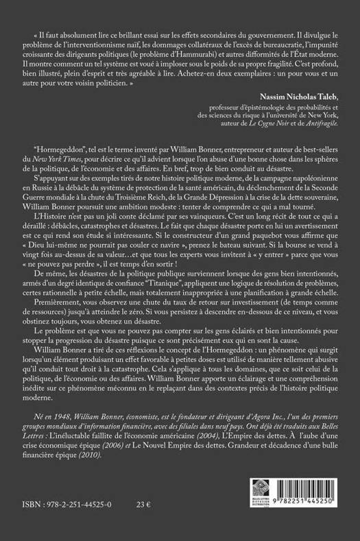 English summary: French translation of William Bonners insightful analysis of disastrous public policies and how seemingly good small-scale solutions go pear-shaped when applied to larger problems. French description: Hormegeddon est le terme invente par l'economiste et entrepreneur William Bonner pour decrire la catastrophe produite par le mauvais dosage d'une bonne chose dans les institutions publiques, les finances ou l'entreprise. Autrement dit: trop de bien mene au desastre. S'appuyant sur des exemples tires de notre histoire politique moderne dans son ensemble - Depuis la campagne de Russie de Napoleon jusqu'a l'effondrement imminent du systeme de protection de la sante americain, du declenchement de la Seconde Guerre Mondiale et de la chute du Troisieme Reich a la guerre contre le terrorisme du XXIe siecle, de la Grande Recession a la crise financiere souveraine - William Bonner poursuit une ambition des plus modestes: essayer de percevoir ce qui a mal tourne. L'Histoire n'est pas ecrite par ses vainqueurs. C'est un long recit de tout ce qui est parti en sucette - debacles, catastrophes et desastres. Que chacun de ces desastres porte en lui des signes annonciateurs est un sujet digne d'attention. Par exemple, si l'architecte d'un grand navire vous dit que meme Dieu ne pourrait pas couler ce bateau , vous devriez prendre le prochain. Si le marche vend a vingt fois plus qu'il n'achete et que tous les experts vous pressent d'en etre parce que vous ne pouvez pas perdre , n'en soyez pas. De la meme facon, vos deconvenues dans les institutions publiques sont le resultat du meme titanique degre de certitude de personnes eclairees et bien intentionnees qui appliquent aux problematiques de longues issues une logique de plan d'action adaptee aux solutions a court-terme. Premierement, vous observez une descente en fleche de vos retours sur investissements (de temps comme de ressources) jusqu'a heurter le sol. Puis, si vous vous obstinez a descendre en-dessous de ce niveau - et vous vous obstinez toujours - vous ne pouvez echapper a la catastrophe. Le probleme etant que cette catastrophe ne peut etre evitee par les personnes eclairees et de bonnes intentions, puisque ce sont elles qui l'ont engendree au depart. William Bonner a tire de ces reflexions l'Hormegeddon, ce phenomene qui survient lorsqu'une petite dose de quelque chose de productif conduit a un resultat favorable, mais tourne au desastre si l'on augmente la posologie. A travers de nombreux episodes de l'Histoire, de l'economie et des affaires, il tisse le contexte permettant de comprendre ce danger anonyme et trop largement meconnu. Vous devez absolument, absolument lire cette exposition des effets secondaires du gouvernement. Elle eclaire le probleme de l'interventionnisme naif, l'iatrogenie des bureaucraties, l'absence grandissante de prise de risques personnels (Le probleme d'Hammurabi), s'ajoutant a d'autres difformites de l'Etat moderne, et montre comment la fragilite d'un tel systeme le condamne a s'ecrouler sous son poids. C'est profond, eclairant, malin et plaisant a lire. Achetez-en deux exemplaires: un pour vous et un pour votre voisin politicien. Nassim Nicholas Taleb, auteur de Antifragile (traduit aux Belles Lettres en 2013) Je suis rarement jaloux de quelqu'un, mais j'envie sincerement les qualites intellectuelles et de plume de Bill Bonner. Je lis ses chroniques tous les jours pour sa prose parfaite et ses vues pertinentes sur l'economie et les marches d'investissements. Mais Hormegeddon est de loin ce que Bonner a produit de meilleur. C'est drole, cynique, sarcastique, hautement pedagogique, magnifiquement ecrit, divertissant, et, le plus important: ecrit par un homme qui ne craint pas de dire la verite et monte au creneau pour elle. Je ne le dis pas souvent, mais lorsque je lis son Hormeggedon, je suis muet de respect. Marc Faber, editeur et directeur de la firme d'investissement Marc Faber Ltd.