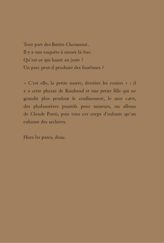 Tout part des Buttes-Chaumont. Il y a une enquête à mener là-bas.Qu’est-ce qui hante au juste ? Un parc peut-il produire des fantômes ? « C’est elle, la petite morte, derrière les rosiers » : il y a cette phrase de Rimbaud et une petite fille qui ne grandit plus pendant le confinement, le mot cave, des phalanstères punitifs pour mineurs, un album de Claude Ponti, puis tous ces corps d’enfants qu’on exhume des archives.Hors les parcs, donc.