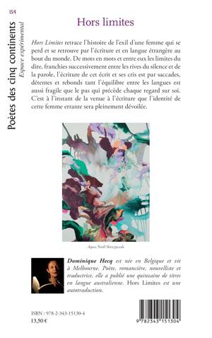 Hors Limites retrace l'histoire de l'exil d'une femme qui se perd et se retrouve par l'écriture et en langue étrangère au bout du monde. De mots en mots et entre eux les limites du dire, franchies successivement entre les rives du silence et de la parole, l'écriture de cet écrit et ses cris est par saccades, détentes et rebonds tant l'équilibre entre les langues est aussi fragile que le pas qui précède chaque regard sur soi. C'est à l'instant de la venue à l'écriture que l'identité de cette femme errante sera pleinement dévoilée.