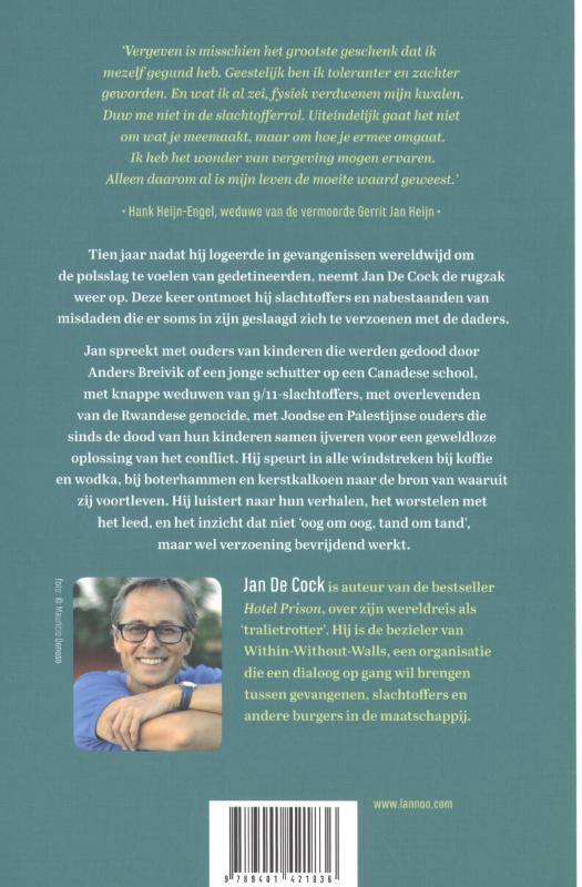 Na 'Hotel Prison' reist Jan De Cock naar slachtoffers die konden vergeven 'Vergeven is misschien het grootste geschenk dat ik mezelf gegund heb. Geestelijk ben ik toleranter en zachter geworden. En wat ik al zei, fysiek verdwenen mijn kwalen. Duw me niet in de slachtofferrol. Uiteindelijk gaat het niet om wat je meemaakt, maar om hoe je ermee omgaat. Ik heb het wonder van vergeving mogen ervaren. Alleen daarom al is mijn leven de moeite waard geweest.' - Hank Heijn-Engel, weduwe van de vermoorde Gerrit Jan Heijn. Tien jaar nadat hij logeerde in gevangenissen wereldwijd om de polsslag te voelen van gedetineerden, neemt Jan De Cock de rugzak weer op. Deze keer ontmoet hij slachtoffers en nabestaanden van misdaden die erin zijn geslaagd zich te verzoenen met de daders. Jan spreekt met ouders van kinderen die werden gedood door Anders Breivik of een jonge schutter op een Canadese school, met knappe weduwen van 9/11-slachtoffers, met overlevenden van de Rwandese genocide, met Joodse en Palestijnse ouders die sinds de dood van hun kinderen samen ijveren voor een geweldloze oplossing van het conflict. Hij speurt in alle windstreken bij koffie en wodka, bij boterhammen en kerstkalkoen naar de bron van waaruit zij voortleven. Hij luistert naar hun verhalen, het worstelen met het leed, en het inzicht dat niet 'oog om oog, tand om tand', maar wel verzoening bevrijdend werkt.