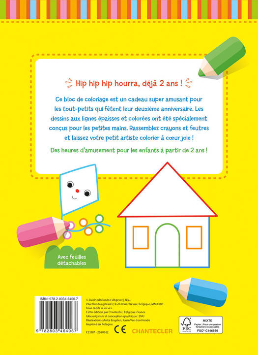 Hip hip hip hourra, déjà 2 ans ! Ce bloc de coloriage est un cadeau amusant pour les tout-petits qui fêtent leur deuxième anniversaire. Les dessins aux lignes épaisses et colorées ont été spécialement conçus pour les petites mains. Rassemplez crayons et feutres et laissez votre petit artiste colorier à coeur joie ! Des heures d'amusement pour les enfants à partir de 2 ans