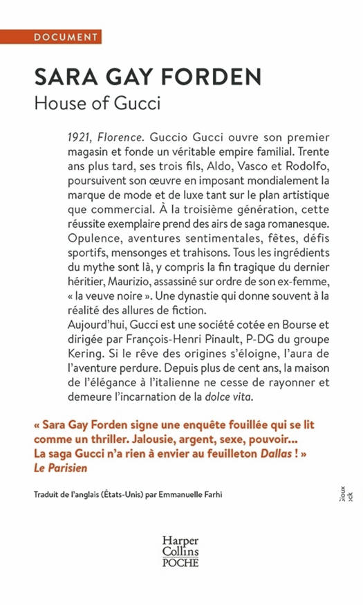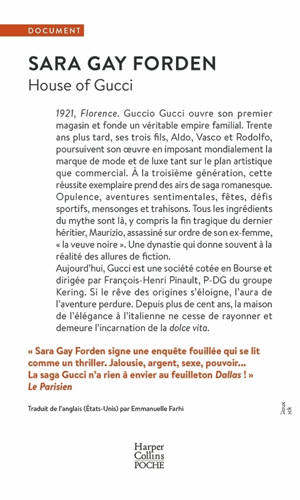 « La journaliste Sara Gay Forden signe une enquête fouillée qui se lit comme un thriller. Jalousie, argent, sexe, pouvoir… La saga Gucci n’a rien à envier au feuilleton Dallas ! » Le Parisien