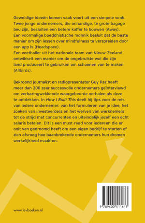 Bekroond journalist en radiopresentator Guy Raz heeft meer dan 200 zeer succesvolle ondernemers geïnterviewd om verbazingwekkende waargebeurde verhalen als deze te ontdekken. In How I built this deelt hij tips voor de reis van iedere ondernemer: van het formuleren van je idee, het zoeken van investeerders en het werven van werknemers, tot de strijd met concurrenten en uiteindelijk jezelf een echt salaris betalen. Dit is een must read voor iedereen die er ooit van gedroomd heeft om een eigen bedrijf te starten of zich afvroeg hoe baanbrekende ondernemers hun dromen werkelijkheid maakten.