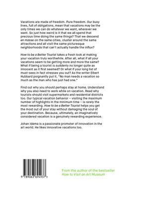 How to Be a Better Tourist offers a fresh perspective on making your vacation truly worthwhile. After all, what if all your vacations seem to be getting more and more the same? What if being a tourist is suddenly no longer quite as innocent as it first seemed? Or what if your long list of must-sees in fact stresses you out? As the writer Elbert Hubbard poignantly put it, No man needs a vacation so much as the man who has just had one.