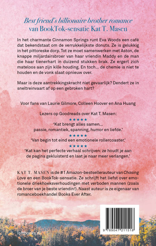 In het charmante Cinnamon Springs runt Eva Woods een café dat bekendstaat om de verrukkelijkste donuts. Ze is gelukkig en gesetteld in het pittoreske dorpsleven. Tot ze moet samenwerken met Aston, de knappe miljardairsbroer van haar vriendin Maddy – en de man die haar tienerhart in duizend stukken brak. Ze ergert zich mateloos aan zijn kille rigide houding. En toch… de chemie is niet te houden en de vonken slaan alweer over.