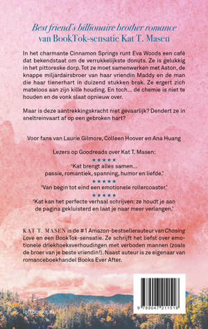 In het charmante Cinnamon Springs runt Eva Woods een café dat bekendstaat om de verrukkelijkste donuts. Ze is gelukkig en gesetteld in het pittoreske dorpsleven. Tot ze moet samenwerken met Aston, de knappe miljardairsbroer van haar vriendin Maddy – en de man die haar tienerhart in duizend stukken brak. Ze ergert zich mateloos aan zijn kille rigide houding. En toch… de chemie is niet te houden en de vonken slaan alweer over. Maar is deze aantrekkingskracht niet gevaarlijk? Met de grote dag en Aston's terugkeer naar New York in zicht, vraagt Eva zich af: is dit haar tweede kans of dendert ze in sneltreinvaart opnieuw naar een gebroken hart? Voor lezers van Colleen Hoover, Laurie Gilmore en Ana Huang.