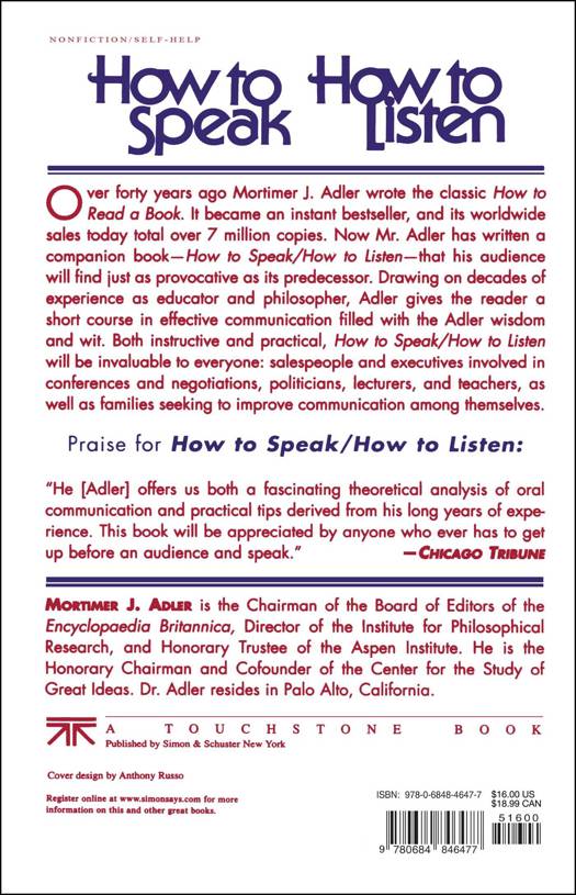 Practical information for learning how to speak and listen more effectively.With over half a million copies in print of his "living classic" How to Read a Book in print, intellectual, philosopher, and academic Mortimer J. Adler set out to write an accompanying volume on speaking and listening, offering the impressive depth of knowledge and accessible panache that distinguished his first book. In How to Speak How to Listen, Adler explains the fundamental principles of communicating through speech, with sections on such specialized presentations as the sales talk, the lecture, and question-and-answer sessions and advice on effective listening and learning by discussion.