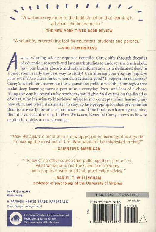 How We Learn, award-winning science reporter Benedict Carey sifts through decades of education research and landmark studies to uncover the truth about how our brains absorb and retain information. What he discovers is that, from the moment we are born, we are all learning quickly, efficiently, and automatically; but in our zeal to systematize the process we have ignored valuable, naturally enjoyable learning tools like forgetting, sleeping, and daydreaming. Is a dedicated desk in a quiet room really the best way to study? Can altering your routine improve your recall? Are there times when distraction is good? Is repetition necessary? Carey's search for answers to these questions yields a wealth of strategies that make learning more a part of our everyday lives--and less of a chore.