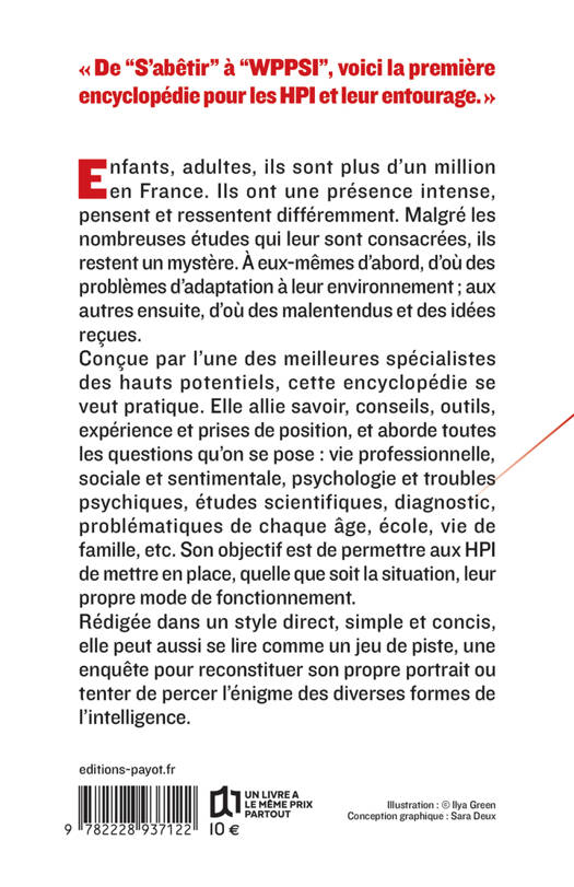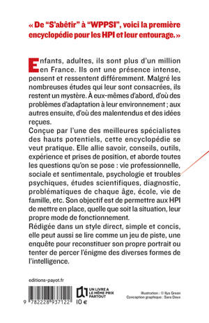 Enfants, adultes, ils sont plus d'un million en France. Ils ont une présence intense, pensent et ressentent différemment. Malgré les nombreuses études qui leur sont consacrées, ils restent un mystère. À eux-mêmes d'abord, d'où des problèmes d'adaptation à leur environnement ; aux autres ensuite, d'où des malentendus et des idées reçues. Conçue par l'une des meilleures spécialistes des hauts potentiels, cette encyclopédie se veut pratique. Elle allie savoir, conseils, outils, expérience et prises de position, et aborde toutes les questions qu'on se pose : vie professionnelle, sociale et sentimentale, psychologie et troubles psychiques, études scientifiques, diagnostic, problématiques de chaque âge, école, vie de famille, etc. Son objectif est de permettre aux HPI de mettre en place, quelle que soit la situation, leur propre mode de fonctionnement. Rédigée dans un style direct, simple et concis, elle peut aussi se lire comme un jeu de pistes, une enquête pour reconstituer son propre portrait ou tenter de percer l'énigme des diverses formes de l'intelligence.