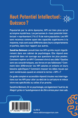 Sandrine Belmont connaît bien les HPI qu'elle reçoit régulièrement dans son cabinet de psychologue. Elle répond avec simplicité dans cet ouvrage aux questions les plus posées : Comment repérer un HPI ? Comment vivre à ses côtés ? Quelles sont ses caractéristiques, ses forces et ses faiblesses ? Comment bien différencier les HPI adultes et enfants et leurs besoins spécifiques ? Comment chasser les idées reçues qui sont nombreuses quand on entend le terme "HPI" ?