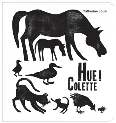 Chaque double page présente les silhouettes noires d'un animal et de son petit ainsi que leur cri.