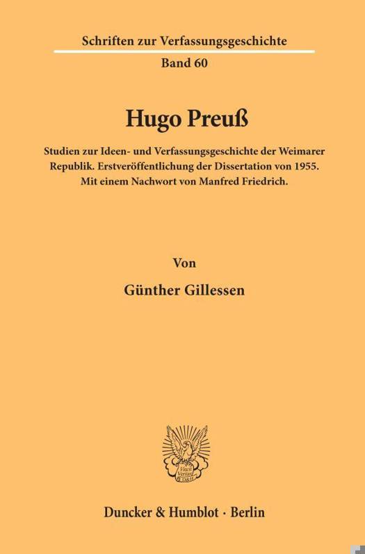 Gillessens 1955 als Dissertation entstandene Arbeit war, so schreibt Manfred Friedrich in seinem Nachwort, die erste, umfassende Arbeit über Hugo Preuß, und eine vergleichbare gebe es bemerkenswerter Weise bis heute nicht.