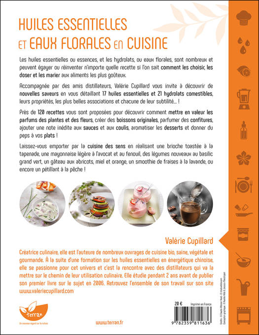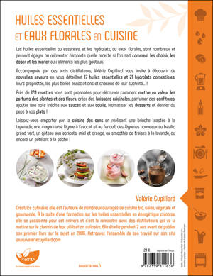 Quelle recette si l’on sait comment les choisir, les doser et les marier aux aliments les plus goûteux. Accompagnée par des amis distillateurs, Valérie Cupillard vous invite à découvrir de nouvelles saveurs en vous détaillant 17 huiles essentielles et 21 hydrolats comestibles, leurs propriétés, les plus belles associations et chacune de leur subtilité… ! Près de 120 recettes vous sont proposées pour découvrir comment mettre en valeur les parfums des plantes et des fleurs, créer des boissons originales, parfumer des confitures, ajouter une note inédite aux sauces et aux coulis, aromatiser les desserts et donner du peps à vos plats ! Laissez-vous embarquer dans la cuisine des sens en réalisant une brioche toastée à la tapenade, une mayonnaise légère à l’avocat et au fenouil, des légumes nouveaux au basilic grand vert, un gâteau aux abricots, miel et orange, un smoothie de fraises à la lavande, ou encore un pétillant à la pêche !