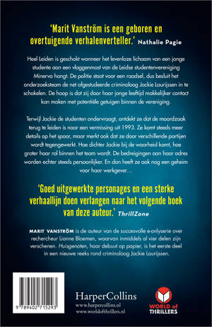 Heel Leiden is geschokt wanneer het levenloze lichaam van een jonge studente aan een vlaggenmast van de Leidse studentenvereniging Minerva hangt. De politie staat voor een raadsel, dus besluit het onderzoeksteam de net afgestudeerde criminoloog Jackie Laurijssen in te schakelen. De hoop is dat zij door haar jonge leeftijd makkelijker contact kan maken met potentiële getuigen binnen de vereniging.