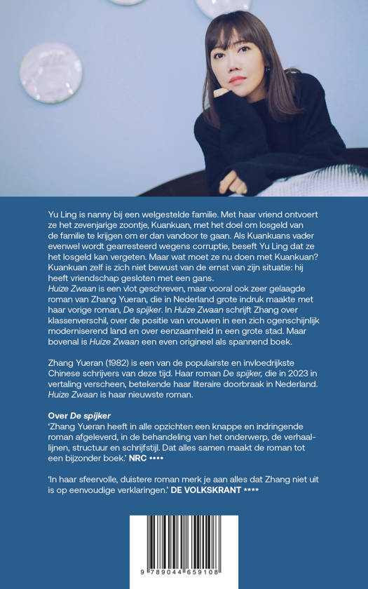 Zhang Yueran (1982) is een van de populairste en invloedrijkste Chinese schrijvers van deze tijd. Haar roman De spijker, die in 2023 in vertaling verscheen, betekende haar literaire doorbraak. Huize Zwaan is haar nieuwste roman.
