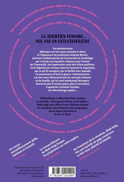 Plébiscité par le «New York Times» comme un écrivain « d'un grand sérieux et de talent », Matt Haig nous offre ici une réflexion incisive et mordante, aussi hilarante que poignante, sur la nature humaine et la vie sur Terre.