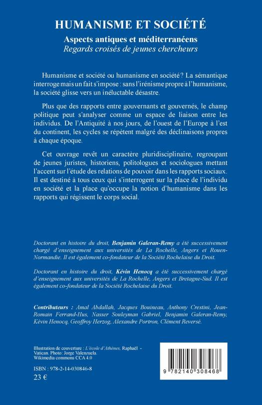Humanisme et société ou humanisme en société ? La sémantique interroge mais un fait s'impose: sans l'irénisme propre à l'humanisme, la société glisse vers un inéluctable désastre. Plus que des rapports entre gouvernants et gouvernés, le champ politique peut s'analyser comme un espace de liaison entre les individus. De l'Antiquité à nos jours, de l'ouest de l'Europe à l'est du continent, les cycles se répètent malgré des déclinaisons propres à chaque époque. Cet ouvrage revêt un caractère pluridisciplinaire, regroupant de jeunes juristes, historiens, politologues et sociologues mettant l'accent sur l'étude des relations de pouvoir dans les rapports sociaux. Il est destiné à tous ceux qui s'interrogent sur la place de l'individu en société et la place qu'occupe la notion d'humanisme dans les rapports qui régissent le corps social.
